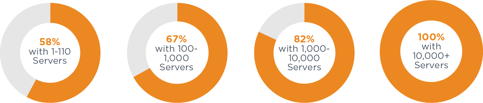 - Even though regulations such as SOX, GDPR, HIPAA, PCI DSS, and FISMA apply to all sizes of deployments, respondents with fewer servers were more likely to believe they were not subject to any regulatory compliance standards. Only fifty-eight percent of respondents with 1-100 servers believed they were subject to regulation. This percentage increased with deployment size: 67 percent of respondents with 100-1000 servers, 82 percent with 1000+ servers and 100 percent with 10,000 servers.