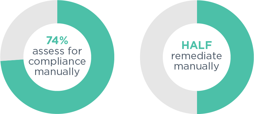 - Prior to reaching production, most teams (74 percent) assess software for compliance manually. Once violations and vulnerabilities are discovered, half of respondents still remediate manually instead of automating the process.