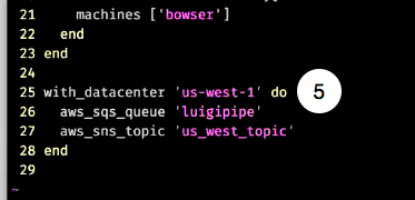 - In this case we can define our multi-component service and the order it should be provisioned in. Very intuitive and obvious. We’ve defined everything within a datacenter and start with creating an “sqs queue” named mariopipes.