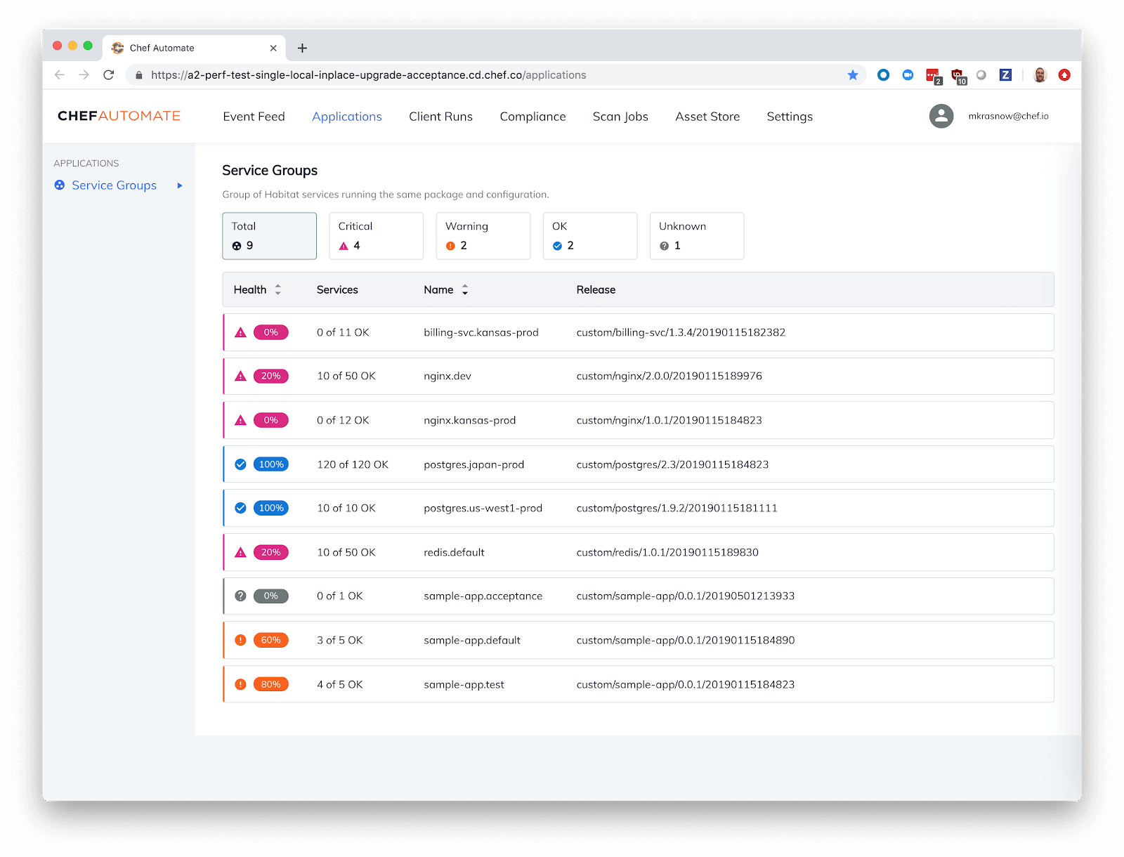 Expanding application portfolios are increasingly difficult to manage over their lifetimes. Operations teams must contend with a variety of applications, both new and old, and updates and changes to any one of these can cause unexpected problems. With the new application operations dashboard in Chef Automate, operations teams gain comprehensive and customizable visibility into the health of the services that make up the application. Now it’s easier to understand what’s degrading the health of your applications so you can keep them running smoothly.