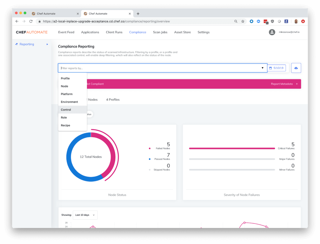Additionally, more powerful filtering and reporting in Chef Automate offers the ability to see how individual security and compliance controls are performing across a heterogeneous estate. This helps simplify compliance reporting and reduce the manual effort needed to address ad hoc requests. For instance, answering an auditor’s request for verification against a specific compliance control can now be done in just a few clicks.