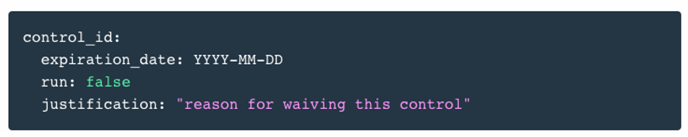 Waivers fulfills the purpose of skipped controls by allowing customers to provide a business justification for controls against which they are unable to be compliant. They can also specify an end date to track when a control should be remediated, or leave it blank to make the waiver permanent. This could be helpful for controls that are either not relevant to the customer’s infrastructural architecture or are handled by another process within the customer’s organization.