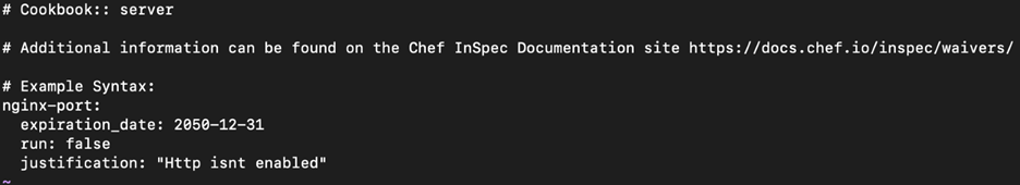 to bundle everything and send it to your Chef server. $ inspec exec compliance/profiles/<profile_name>/controls/<control.rb> --waiver-file compliance/waivers/<waiver-file.yml>
