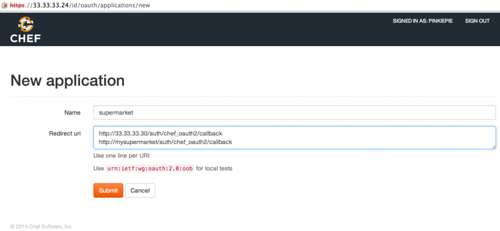 NOTE: the Redirect URL must contain the oauth2 callback URL, which is /auth/chef\_oauth2/callback