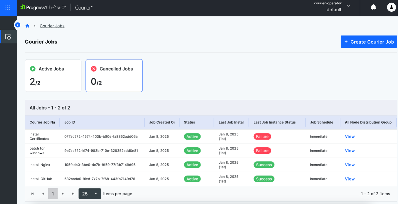 You can use the Courier User Interface (UI) to view and create Courier jobs within the Chef 360 Platform UI.