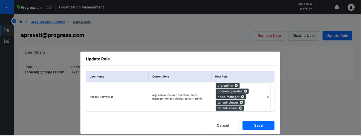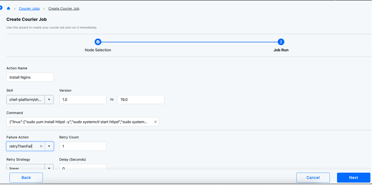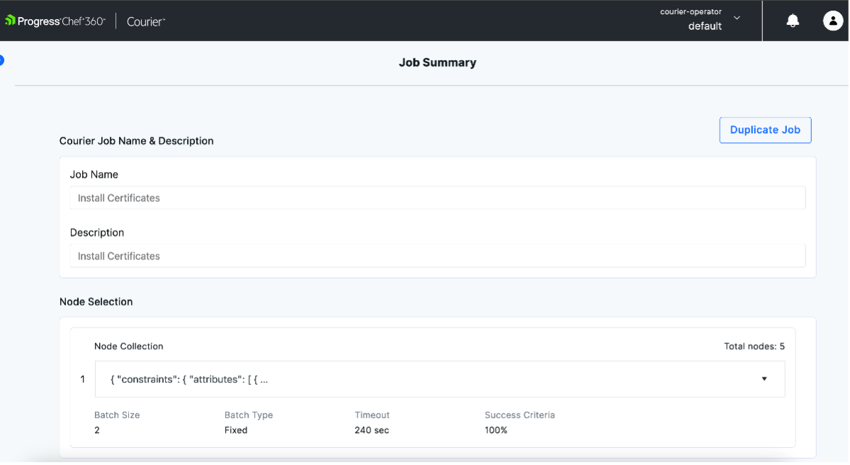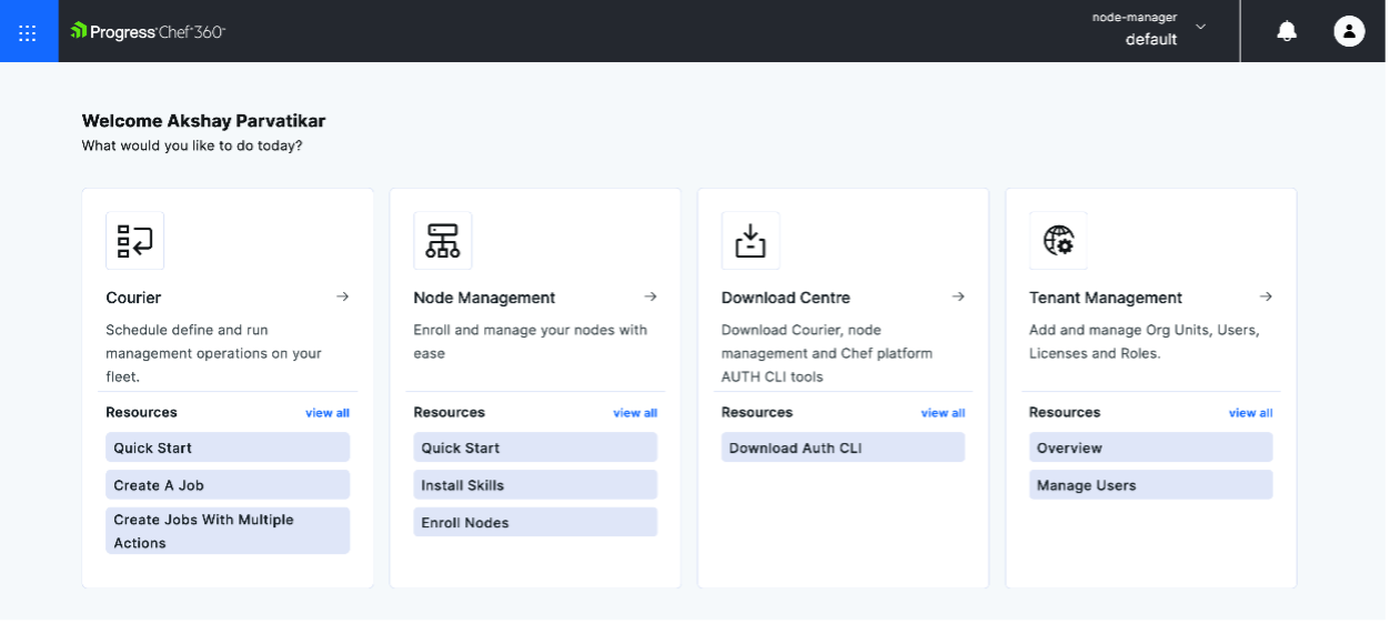 Progress Chef Courier User Interface (UI) streamlines the customer experience by providing an intuitive interface for managing and executing jobs on the managed nodes. The UI also provides administrative access to users with permissions and license control.