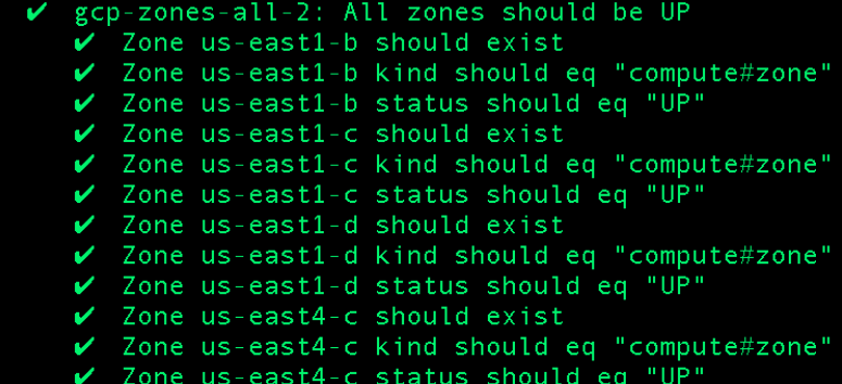 This is fine but we had to supply the zone name ‘us-east1-b’. What if new zones are added that our company uses immediately, does the test need to be updated? Ideally we want to insulate ourselves from these kind of details and run across all available GCP zones each time. This is how InSpec helps us achieve that with plural resources (more details here):