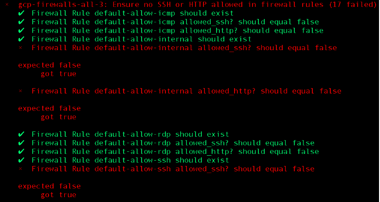 Hopefully the above demonstrates that with only minimal customization, InSpec continuous compliance checks can be a powerful tool for those using GCP or indeed other cloud providers. As previously mentioned, the inspec-gcp resource pack welcomes suggestions for improvement or contributions from the community. The sample compliance profile containing the above checks is available here.