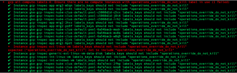 This is slightly more involved so let’s step through through what’s happening. Supplying only the GCP project name to this control, we first retrieve all available zones and loop over them. For each zone the list of compute instances are then also retrieved. Next we examine each compute instance individually and confirm whether or not our favorite “operations_override_do_not_kill