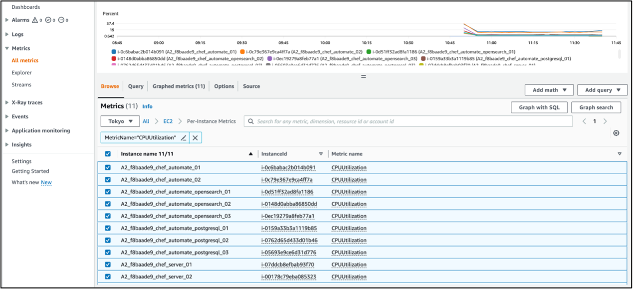 Metrics Explorer can be leveraged to monitor Chef Automate HA resources by tags. By choosing Explorer under the Metrics menu, the ability to filter, aggregate and visualize data by tags and properties is made available.