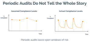 The toughest pill to swallow about audits is even though so much time and effort is spent auditing and mitigating risk, in reality there’s zero visibility between audits. Audits instead are singular snapshots and provide little insight into the compliance state over time. Organizations likely follow a pattern where compliance levels spike during the flurry of work around the audit, then fall off quickly after the audit is completed, only to spike again with the next audit. The limited visibility between audits amounts to considerable risk that should be unacceptable, particularly for financial institutions.