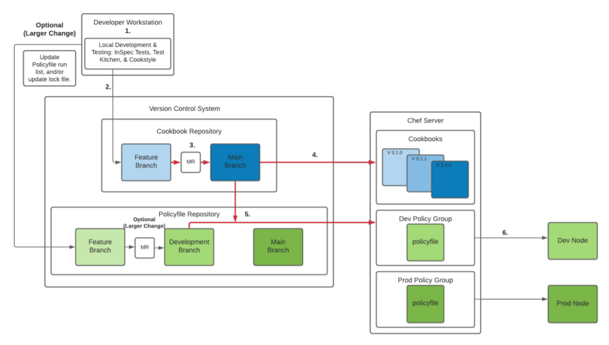 Workflow updating cookbook code using GitLab pipelines (highlighted in red)