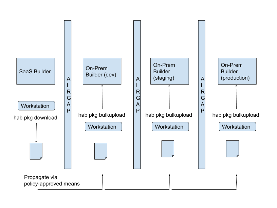 In this scenario, the hab pkg download could be used to generate the set of desired artifacts that could then be zipped and moved to the internal environments, and then uploaded via the hab pkg bulkupload command.