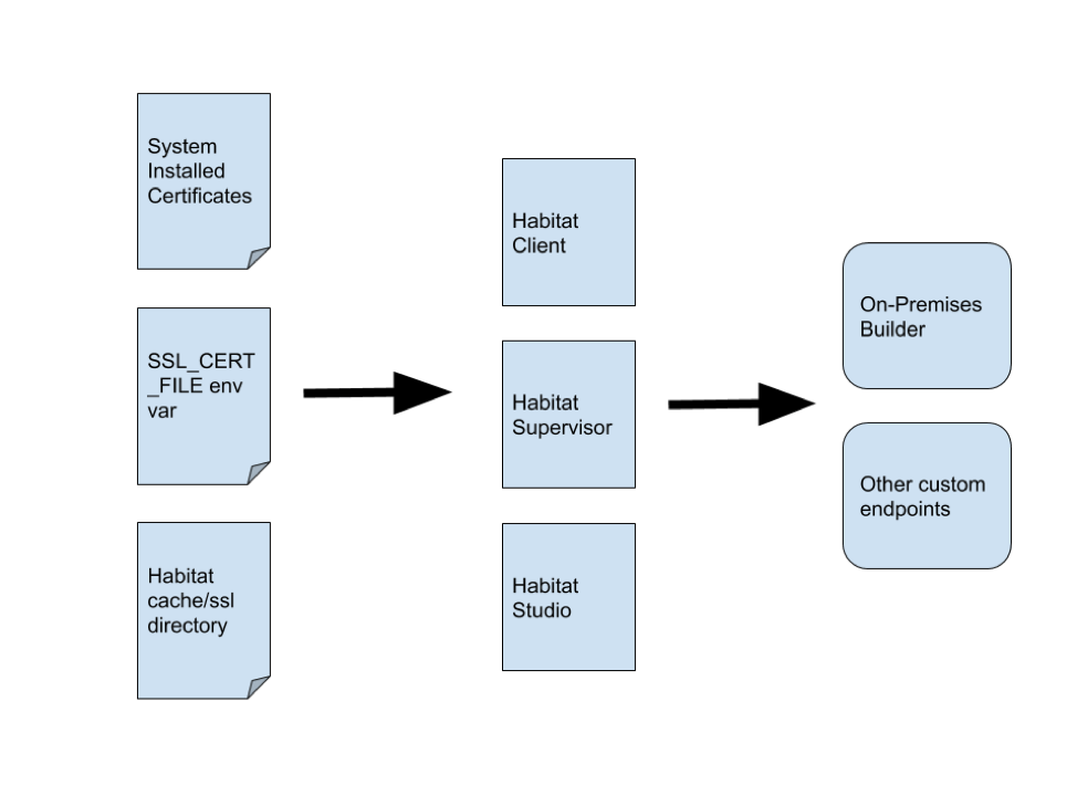 The main scenarios for Habitat Builder installations are the cases where Habitat Builder services need to reach out to external endpoints – for example, an OAuth endpoint that may be set up with a custom TLS certificate.