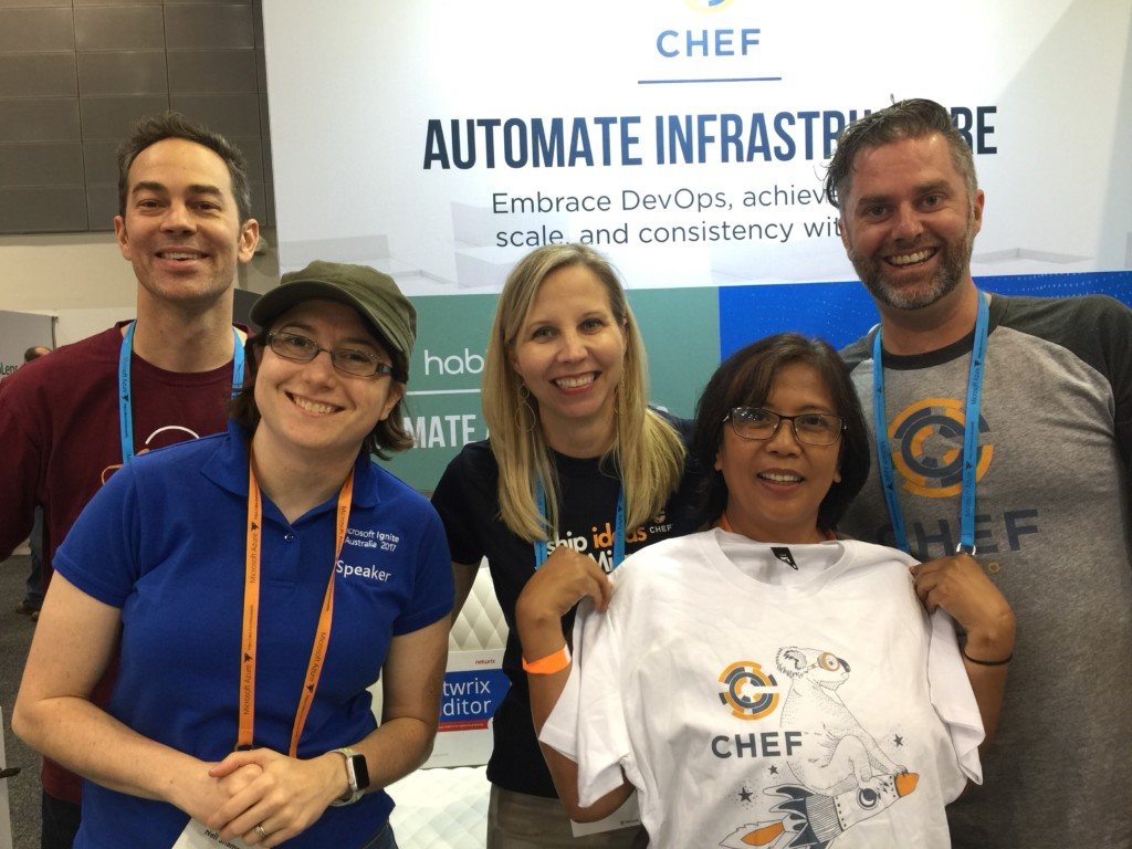 Chef had our first presence at Microsoft Ignite Australia in the Gold Coast February 14-17 and it was truly amazing! Wendy Smith, Nell Shamrell, and I made the long journey down under from our Seattle headquarters to join our team in Australia: Paul Took and Matt Ray. Paul and Matt have been getting Chef activity heating up these past 8 months.