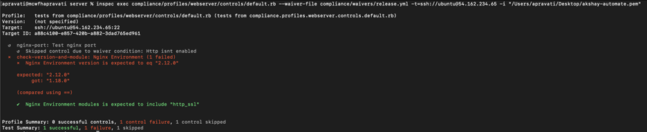 to bundle everything and send it to your Chef server. $ inspec exec compliance/profiles/<profile_name>/controls/<control.rb> --waiver-file compliance/waivers/<waiver-file.yml>