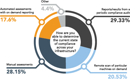 Continuous automation provides a third option. Instead of sacrificing your rate of innovation or your compliance rigor, you can solve for both concerns by evaluating compliance continuously from early development all the way through production, ensuring that every change you make provides real-time feedback on its compliance impact. Chef recently conducted a survey where respondents were asked how they determine the current state of their compliance. Roughly half required ad-hoc evaluation of target systems, either manually or via a scanning utility. Nearly a third relied on reports from previously run audits. In either case, compliance slippage is all but guaranteed. Ad-hoc assessments provide only a snapshot of a subset of your systems, and don’t provide a complete picture if not run continuously across your environments. Similarly, historical audit data can only be fully trusted insofar as environments have remained static since the report was generated, something few organizations can take for granted.