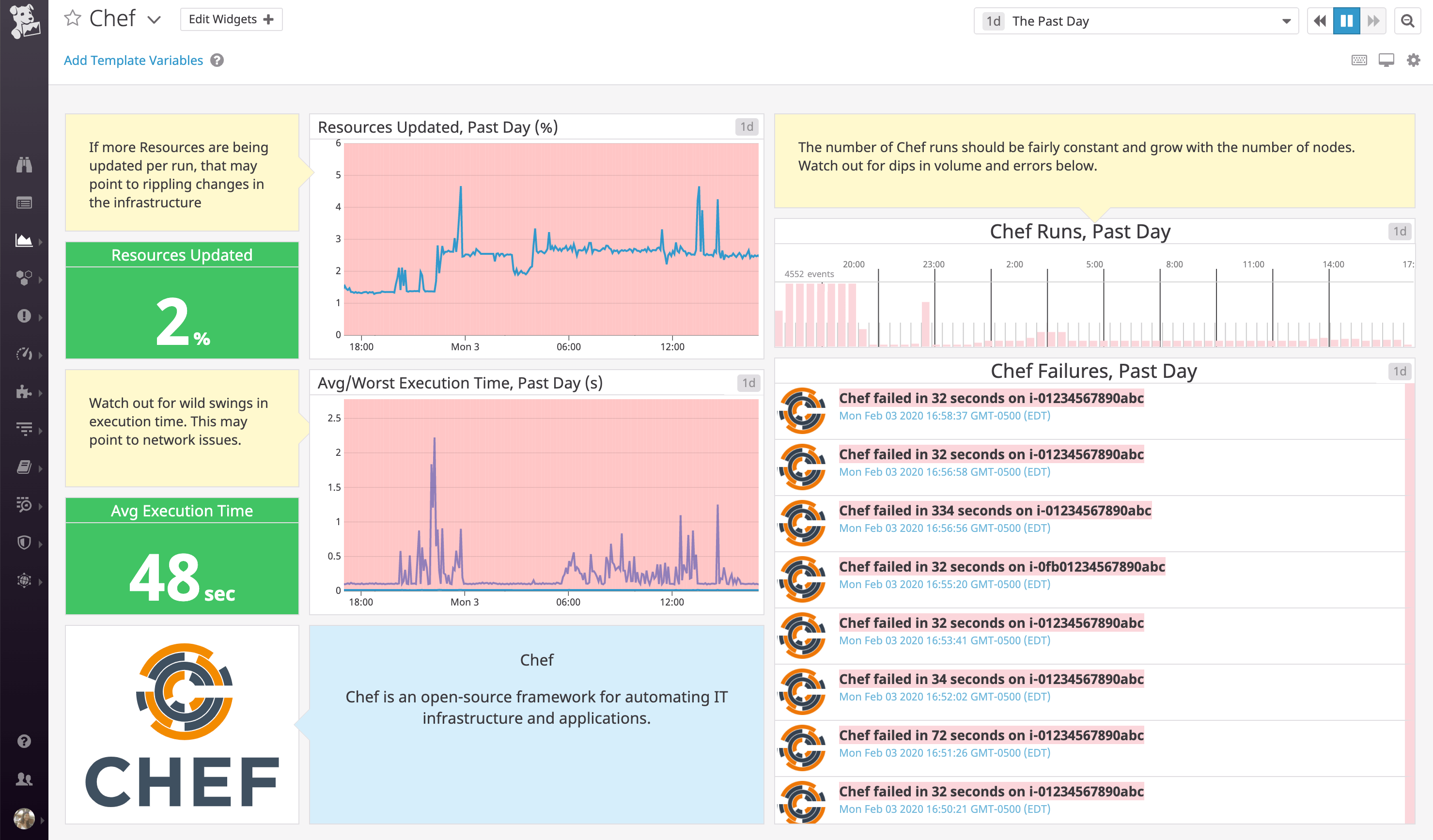 Datadog’s Chef integration also enables you to monitor the status of every run, quickly investigate failed executions, and monitor Chef events alongside real-time performance data from all of your Chef-managed infrastructure components.