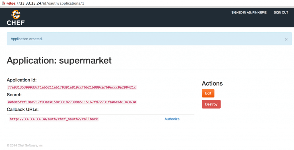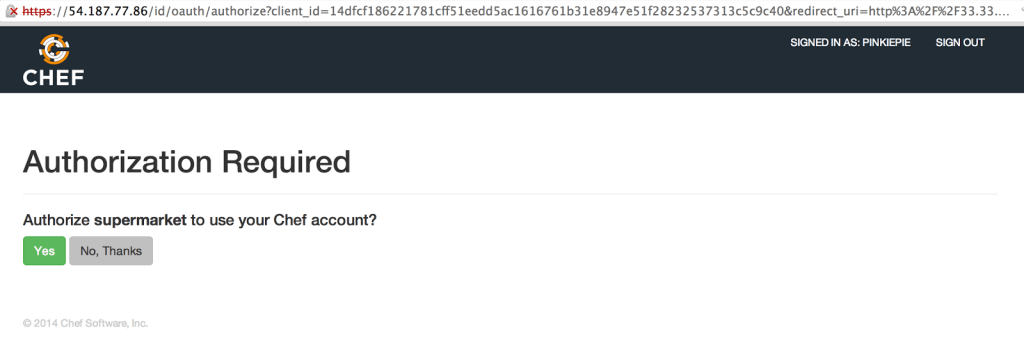 4: Once running navigate to http://33.33.33.10 and log in to your new Supermarket instance. You will see a request to authorize the application. This only needs to happen once.