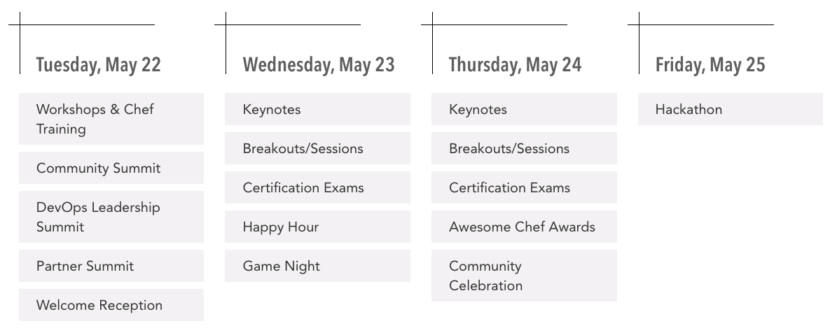 ChefConf includes technical sessions, workshops, certification exams, social activities, and more. Here is a quick overview of what you can expect, and when!