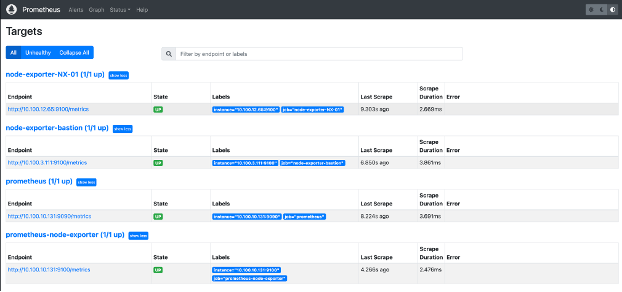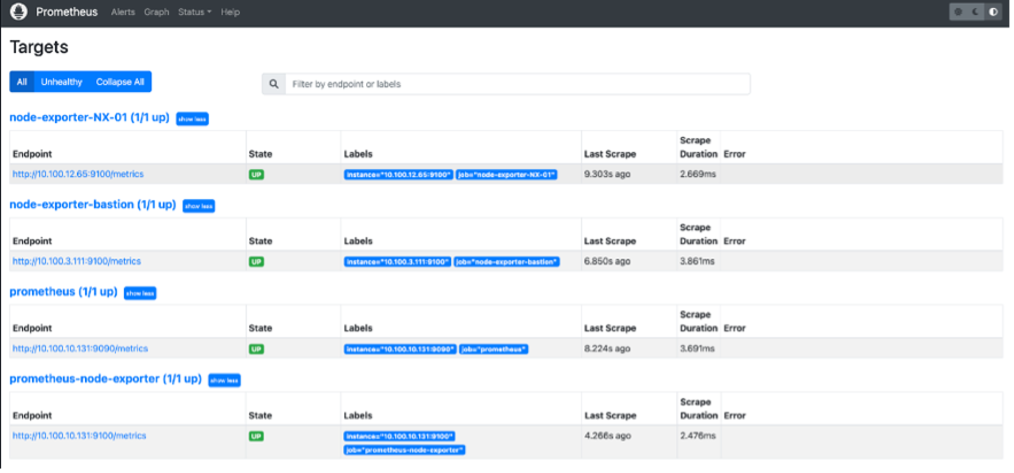 - Port Configuration - Each Prometheus exporter runs on separate ports. Please ensure all required ports are open from the Prometheus server to exporters.