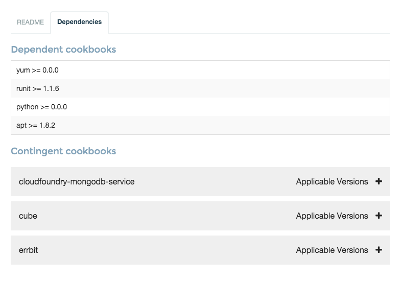 Previously, when you viewed the “Dependencies” tab for a cookbook, you only saw the dependencies for the cookbook in question. Now, you can see not only dependencies, but cookbooks that are contingent upon the cookbook in question as well.