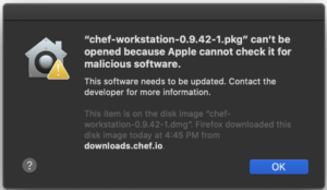 With the release of MacOS Catalina (10.15) we have become aware of an issue with our omnibus based installers. This only affects users who upgrade to MacOS Catalina. When trying to install the Chef Workstation by double-clicking on the .pkg