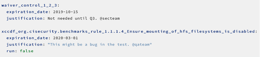 Waivers enable users to justify exceptions to specific controls where compliance is not met. The YAML-based waiver file comprises code blocks that specify the control to be exempted and the rationale behind granting the exemption.